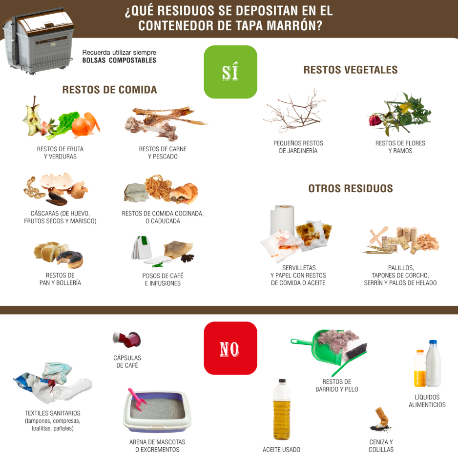En el contenedor marrón se deben depositar los restos de comida (restos de frutas y verduras, restos de carne y pescado, cascaras de huevo, marisco o frutos secos, restos de comida cocinada o caducada, pan, bollería, posos de café e infusiones…), los restos vegetales (pequeños restos de jardinería, restos de flores y ramos…) y otros residuos (palillos, tapones de corcho, serrín y palos de helado, servilletas y papel con restos de comida o aceite…).